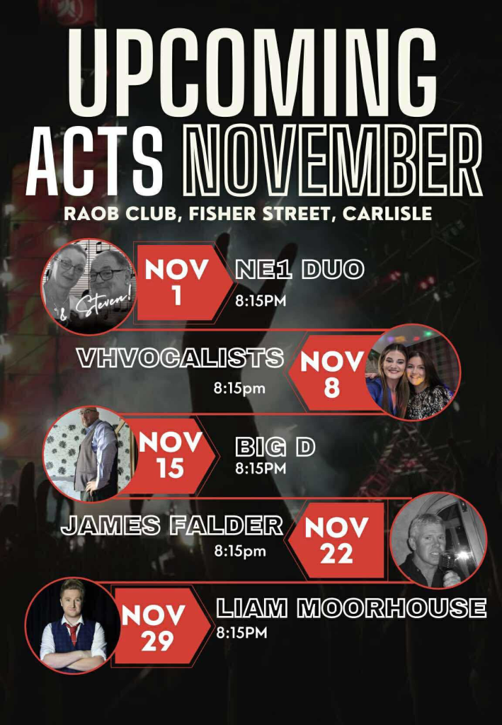 1st November Ne1 Duo 8th November VHVOCALISTS 15th November BIG D 22nd NOVEMBER James Falder